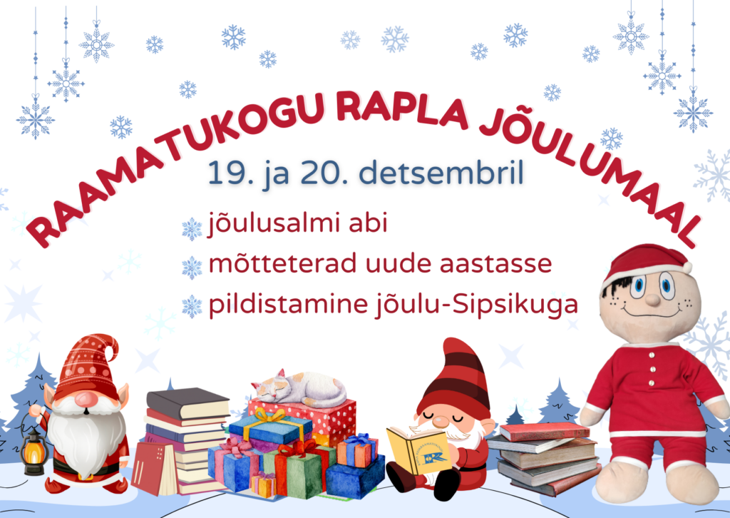 Rapla Keskraamatukogu | Lasteaia 5, Rapla, 79512 | info@raplakrk.ee | Kojulaenutus: 485 5464 | Lugemissaal: 489 4039 | reg nr. 75024202 | a/a EE154204278617116209