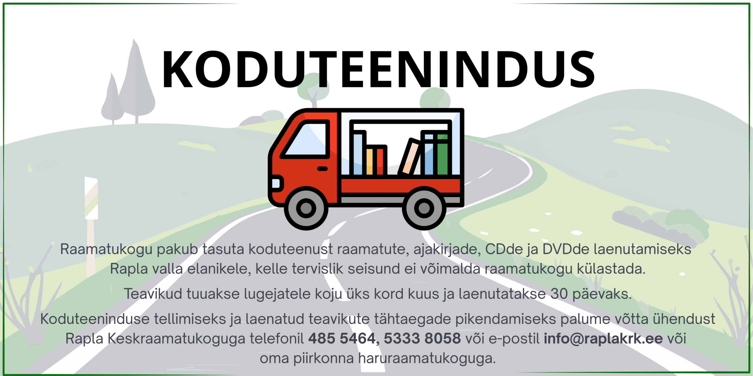Rapla Keskraamatukogu | Lasteaia 5, Rapla, 79512 | info@raplakrk.ee | Kojulaenutus: 485 5464 | Lugemissaal: 489 4039 | reg nr. 75024202 | a/a EE154204278617116209