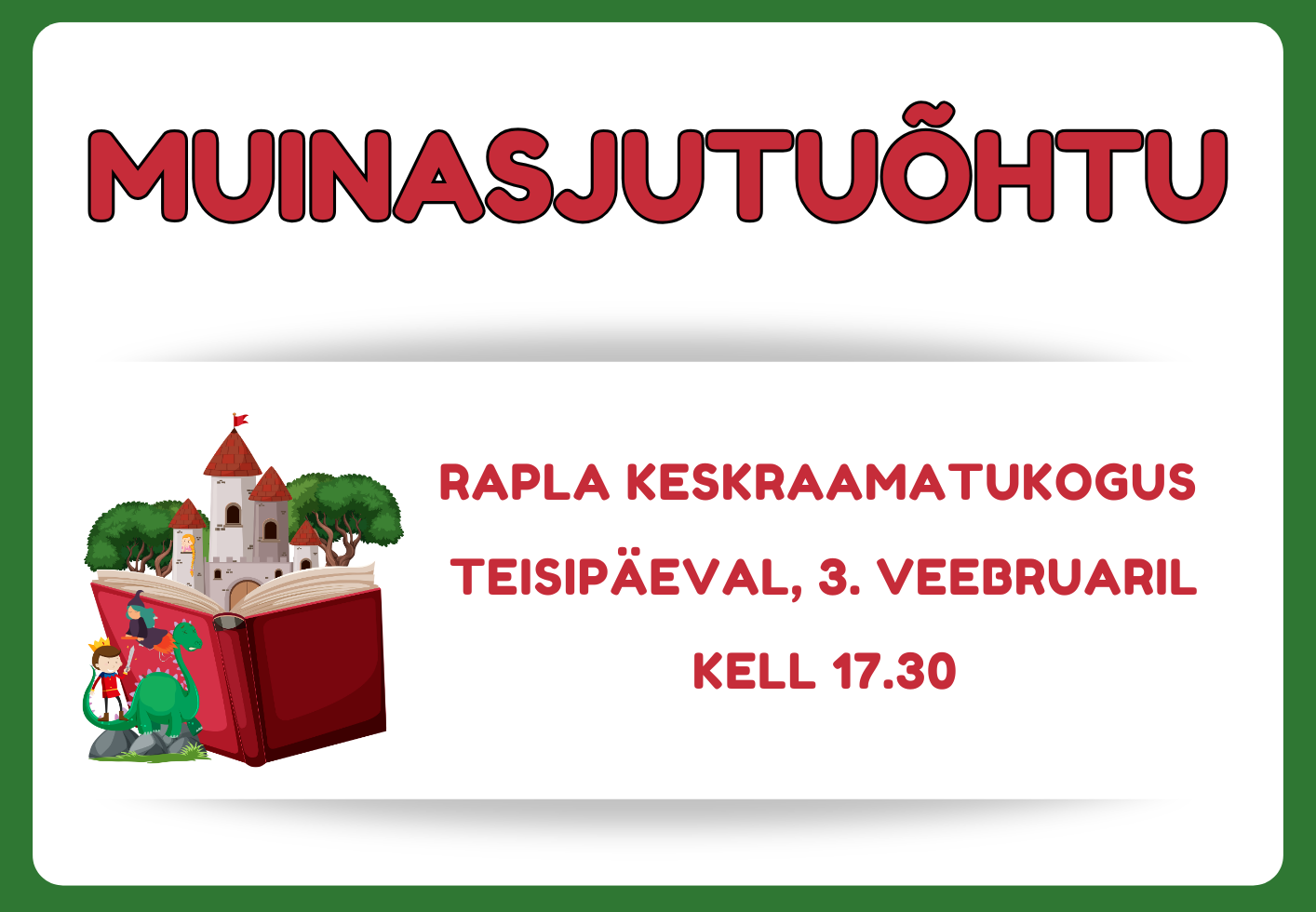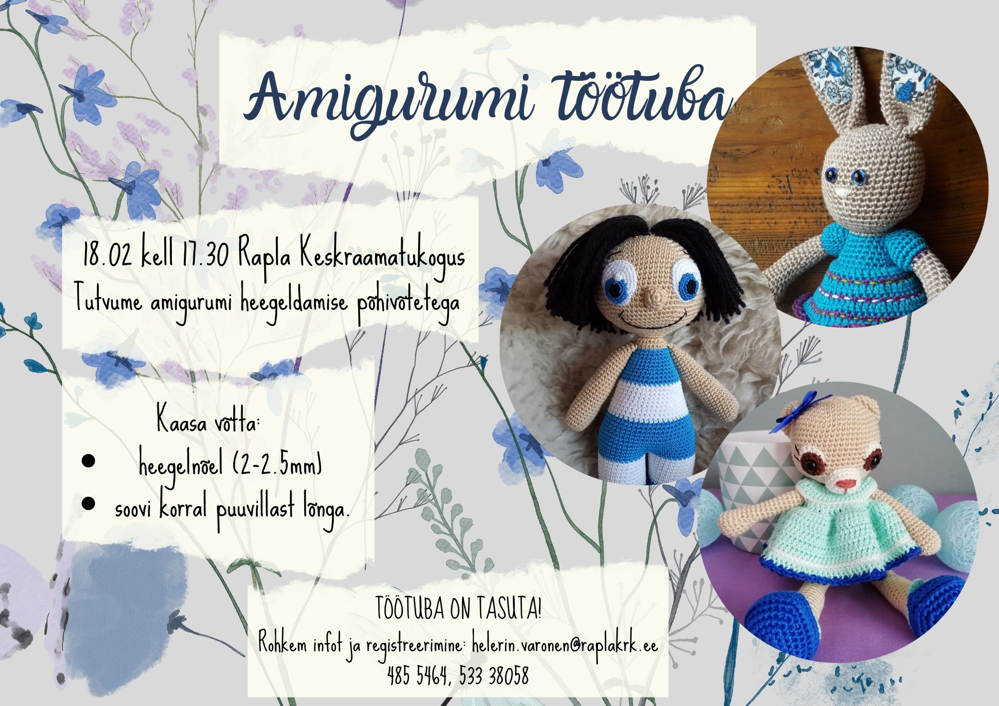 29. jaanuaril kell 17.30 tähistame eesti kirjanduse päeva Mart Juurega 20. jaan. 202622. jaan. 2026 Loe edasi 3. veebruaril kell 17.30 – Muinasjutuõhtu 19. jaan. 202626. jaan. 2026 Loe edasi 5. veebruaril kell 17 – Helga Kõrge näituse tutvustus 19. jaan. 202626. jaan. 2026 Loe edasi 11. veebruaril kell 16.00 – Teetund raamatuga 19. jaan. 202626. jaan. 2026 Loe edasi 18. veebruaril kell 17.30 – Amigurumi töötuba 19. jaan. 202622. jaan. 2026 Loe edasi 21. jaanuaril – Lauamänguklubi 12. jaan. 202622. jaan. 2026 Loe edasi1 2 … 50 Next →