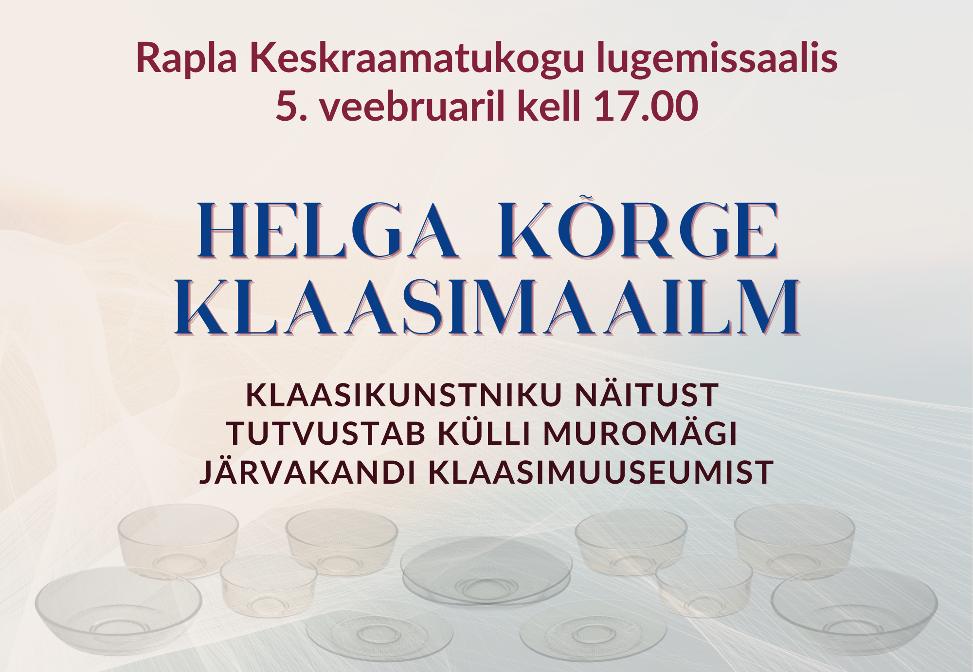 “Rauad – üks parem kui teine” – laenutusosakonnas; “Inimeste lood ja mõttepeeglid: Margus Mikomägi 70” – laenutusosakonna vitriinis; “Talve võlumaa” – lastealal; “Raplamaa tähtpäevakalender: jaanuar-veebruar” – lugemissaalis; Muud väljapanekud: Võtmehoidjaid…