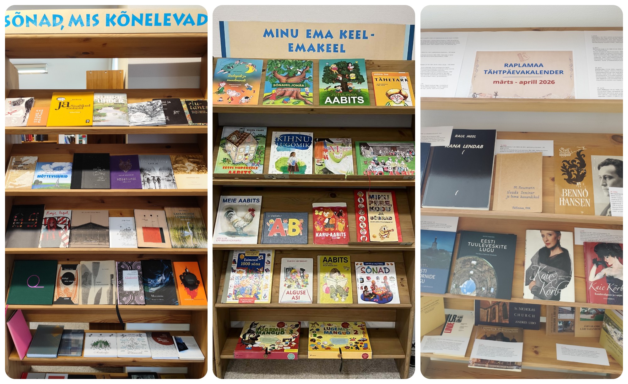 “Sõnad, mis kõnelevad” – laenutusosakonnas; “Kirjandusminister Mart Juur soovitab” – laenutusosakonna vitriinis; “Minu ema keel – emakeel” – lastealal; “Raplamaa tähtpäevakalender: märts-aprill” – lugemissaalis; Muud väljapanekud: Mängupandad Reino Gustav Tammepuu…